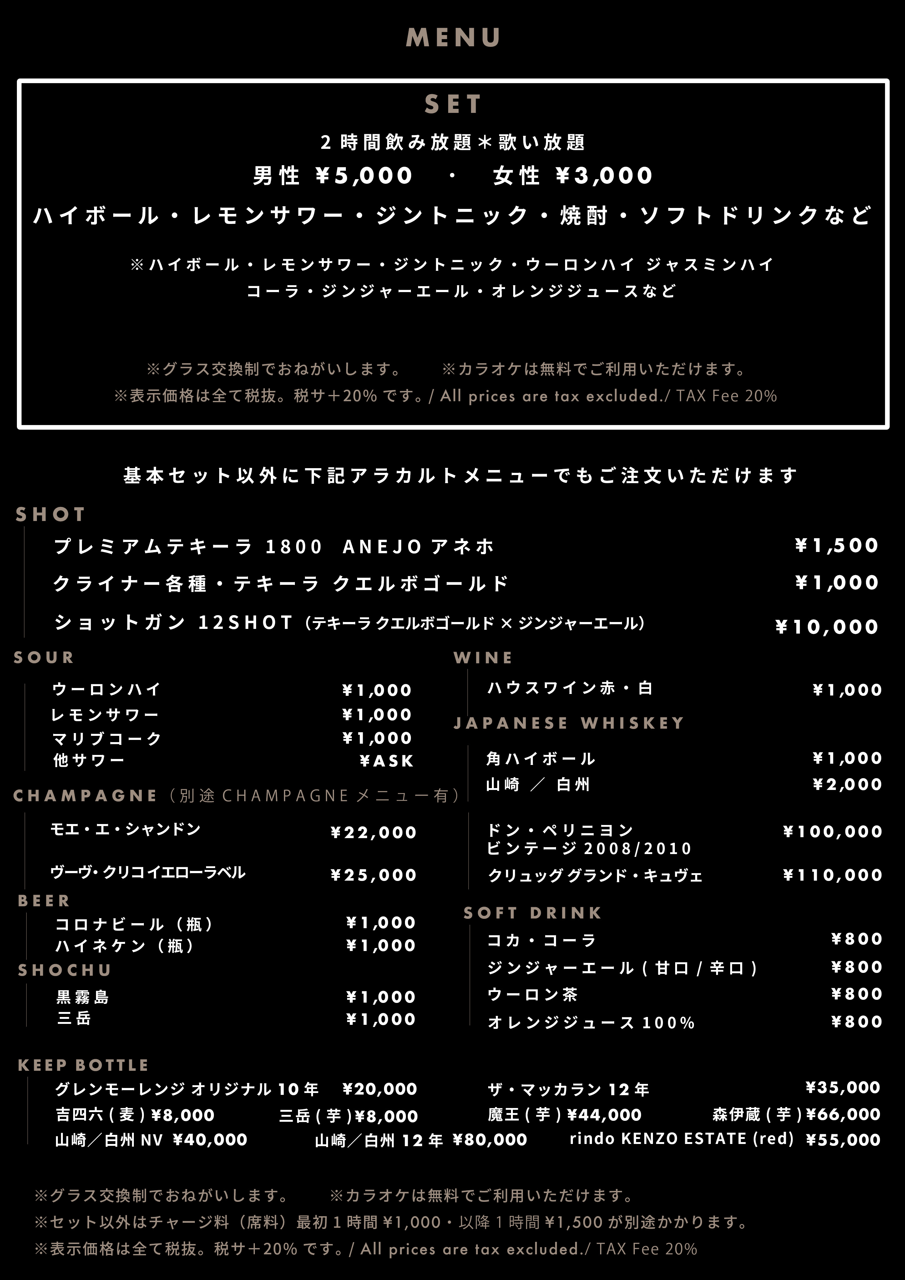 通常営業時のセット料金セット料金、ボトル料金などのご確認はこちら。